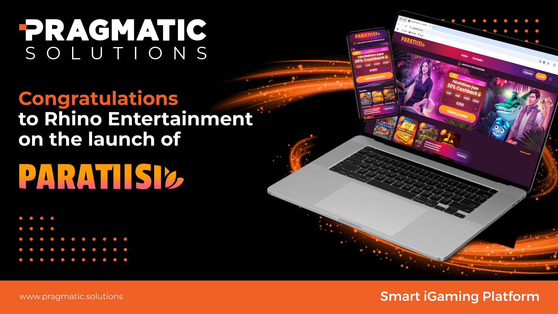 Pragmatic Solutions, provider of smart iGaming platform technology, joins Rhino Entertainment Group in celebrating the launch of their sixth online casino brand, ‘Paratiisi’ on the Pragmatic Solutions PAM platform.